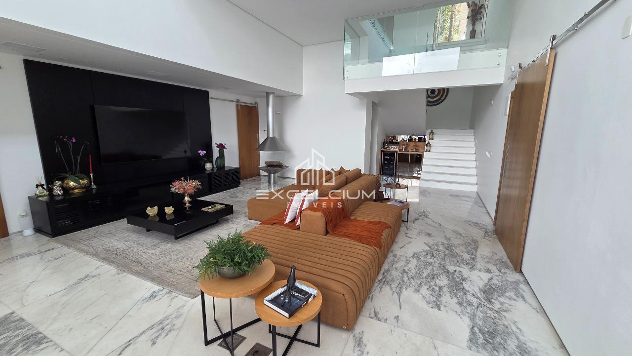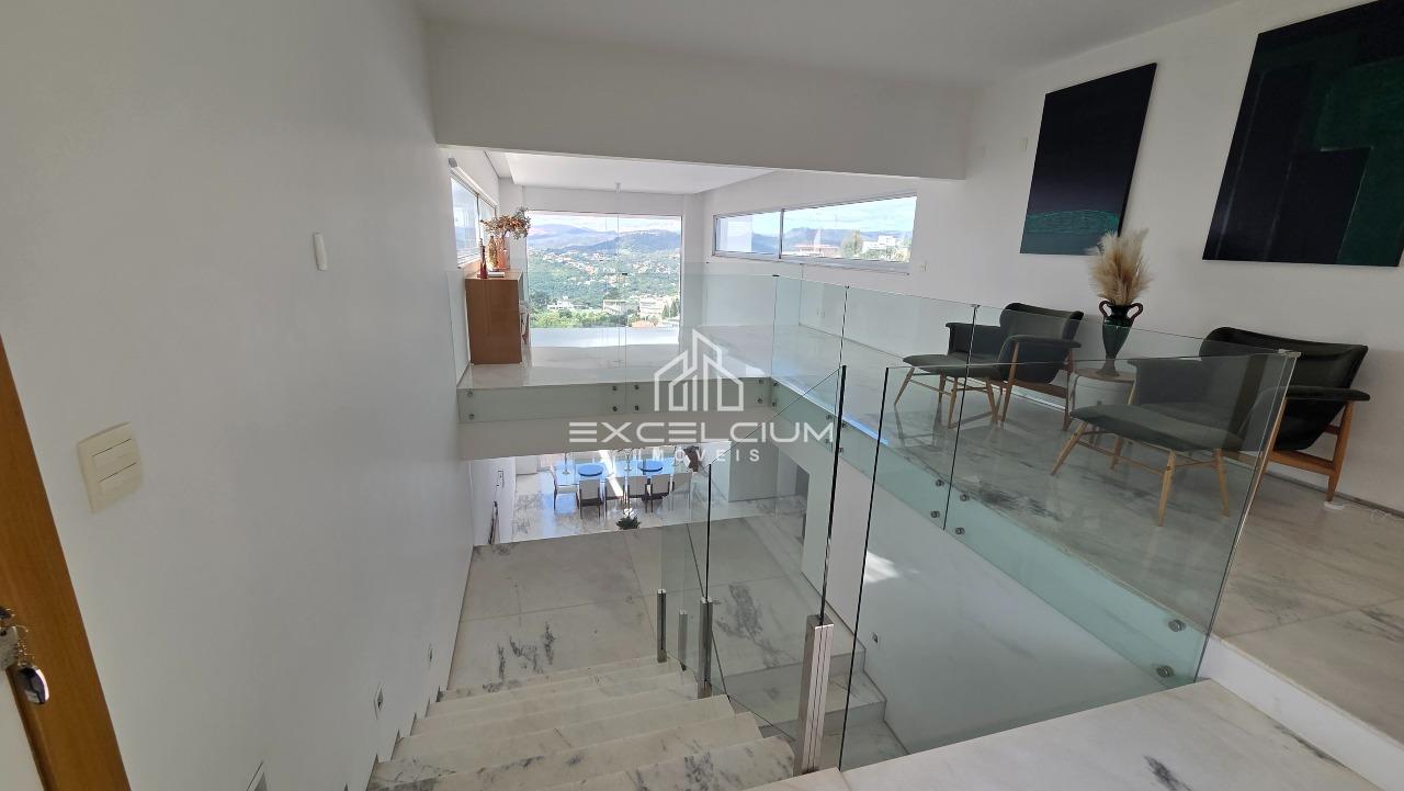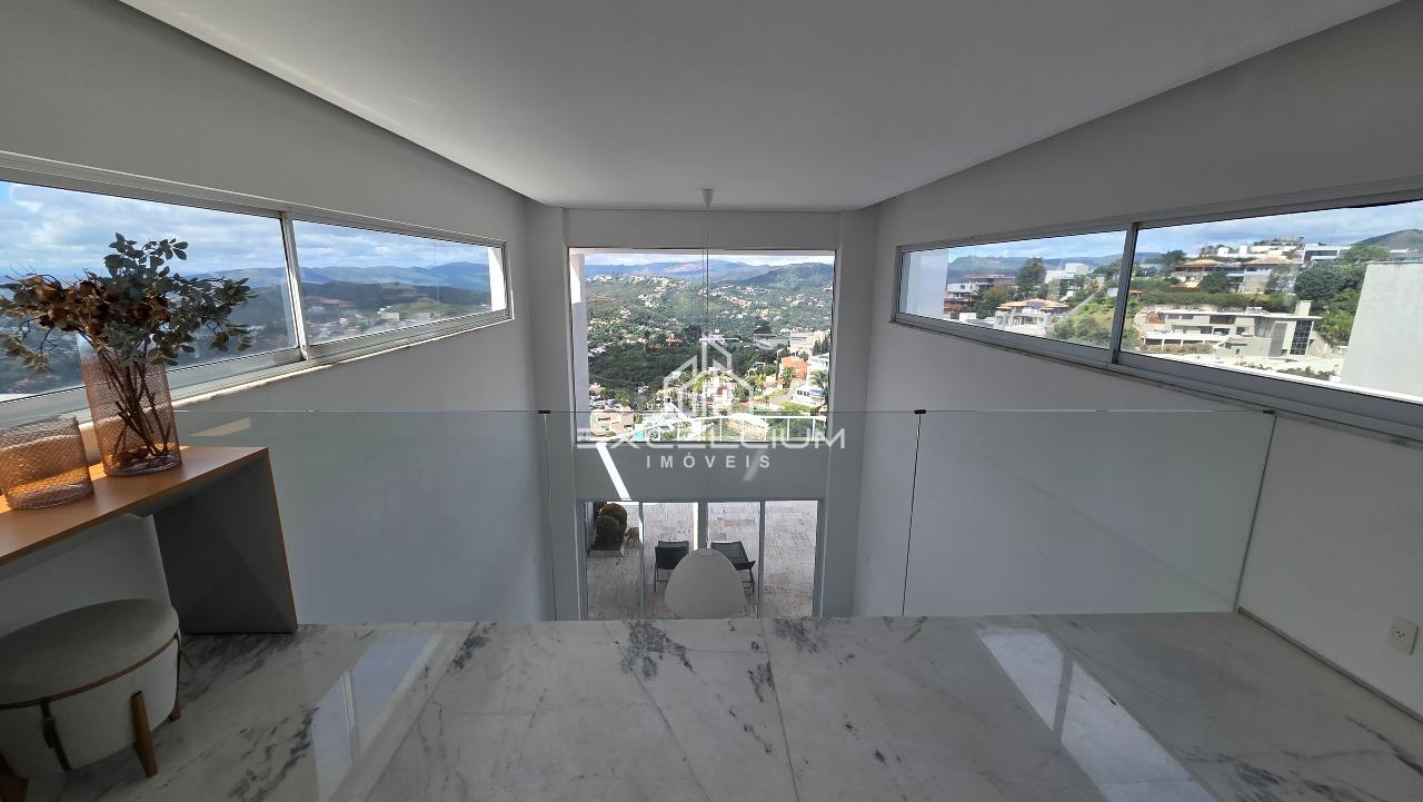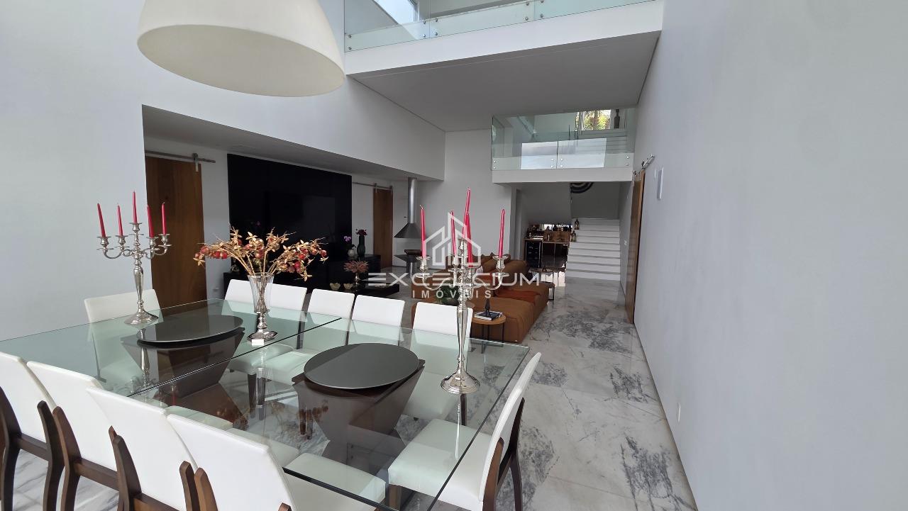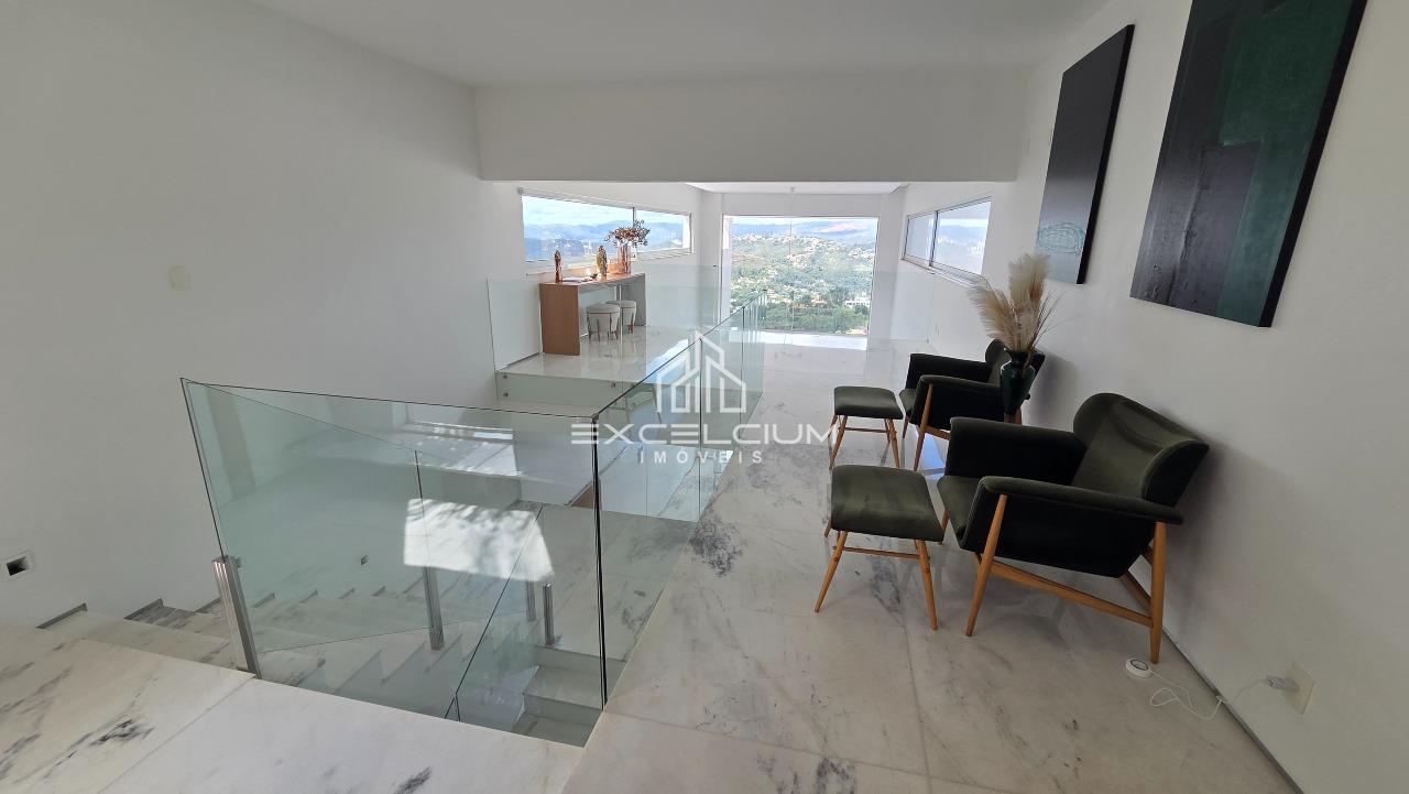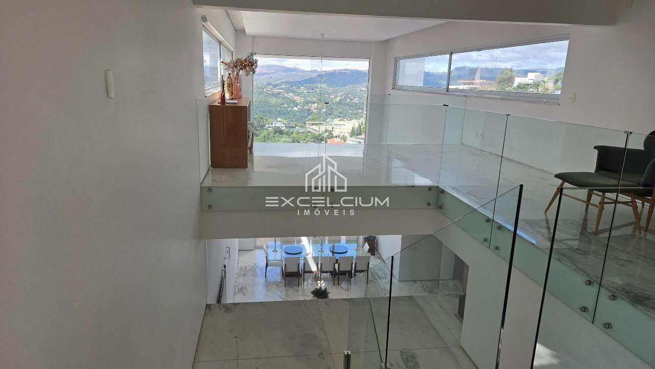 Casa linear com vista aberta para a serra, em composição que privilegia amplitude, integração e conforto. O acesso é feito por escada, mas toda a área social e íntima se desenvolve em um único piso, favorecendo praticidade no dia a dia. A sala principal, com pé-direito duplo, piso em mármore Carrara e lareira, reúne imponência arquitetônica e luminosidade natural, sempre valorizada pela paisagem ao entorno. Na área íntima, são quatro quartos, sendo duas suítes e duas semissuítes, com pisos em taco que acrescentam acolhimento aos ambientes. A suíte master conta com closet generoso e banho com hidromassagem. Lavabo, cozinha com piso e bancada em granito preto, despensa, área de serviço e DCE completam a rotina com funcionalidade.