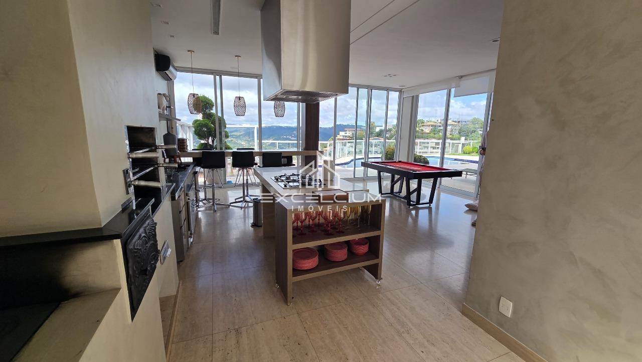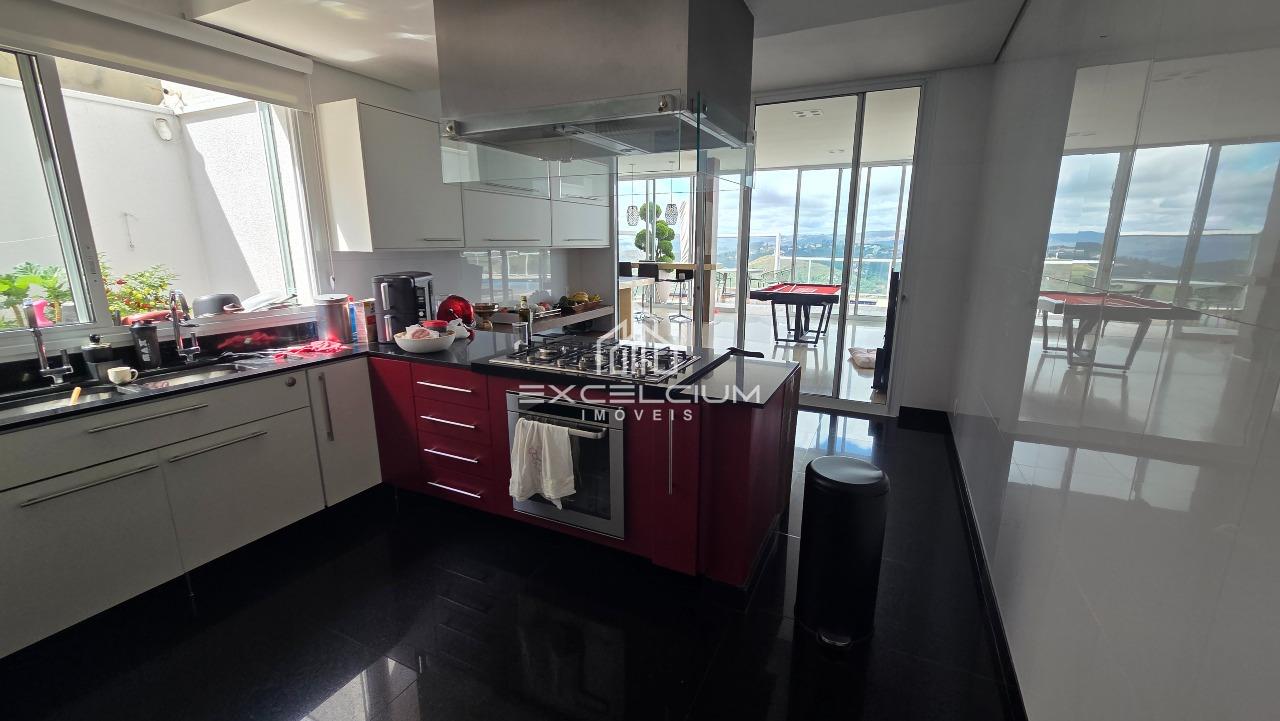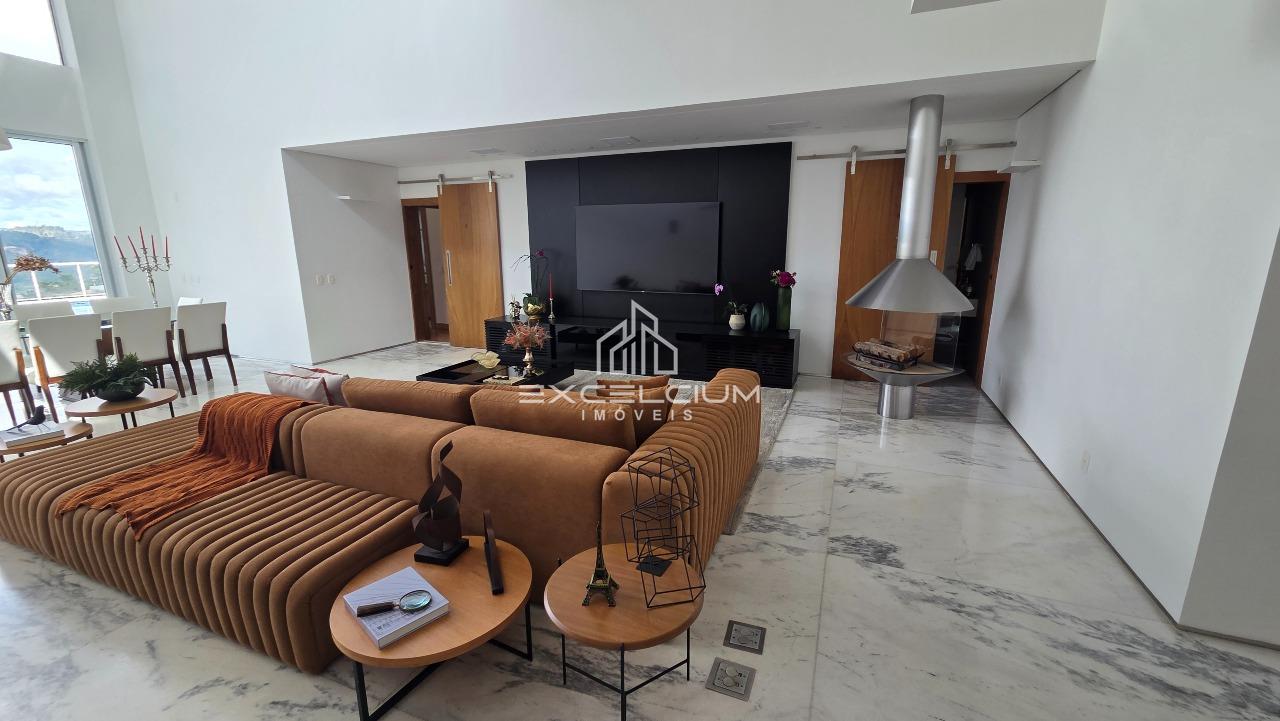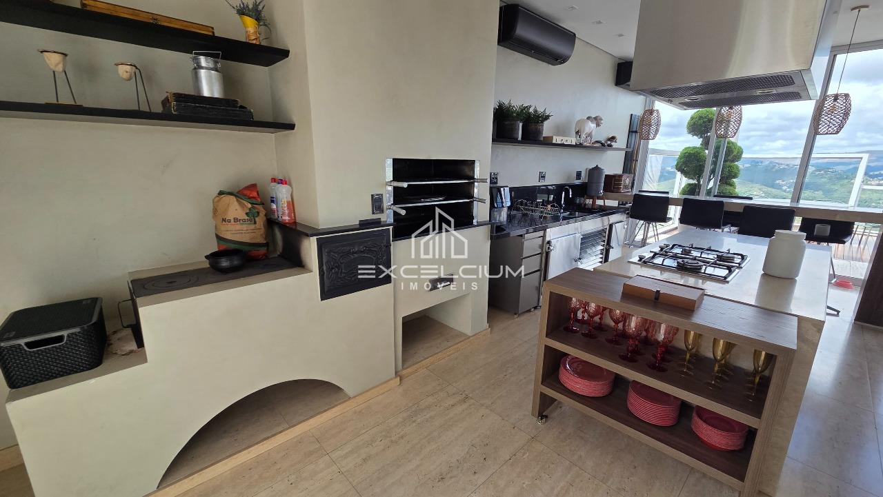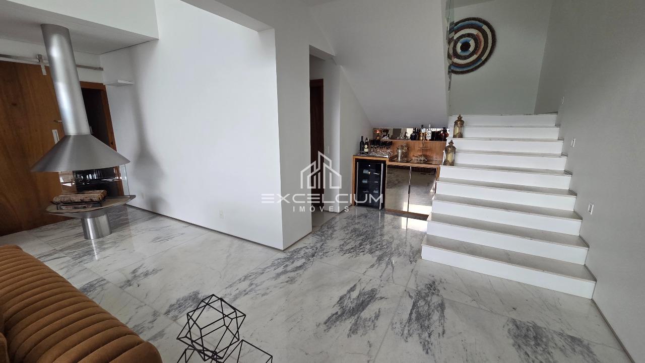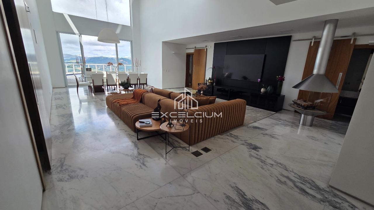 Casa linear com vista aberta para a serra, em composição que privilegia amplitude, integração e conforto. O acesso é feito por escada, mas toda a área social e íntima se desenvolve em um único piso, favorecendo praticidade no dia a dia. A sala principal, com pé-direito duplo, piso em mármore Carrara e lareira, reúne imponência arquitetônica e luminosidade natural, sempre valorizada pela paisagem ao entorno. Na área íntima, são quatro quartos, sendo duas suítes e duas semissuítes, com pisos em taco que acrescentam acolhimento aos ambientes. A suíte master conta com closet generoso e banho com hidromassagem. Lavabo, cozinha com piso e bancada em granito preto, despensa, área de serviço e DCE completam a rotina com funcionalidade.