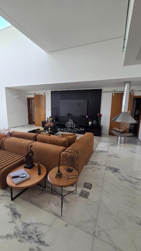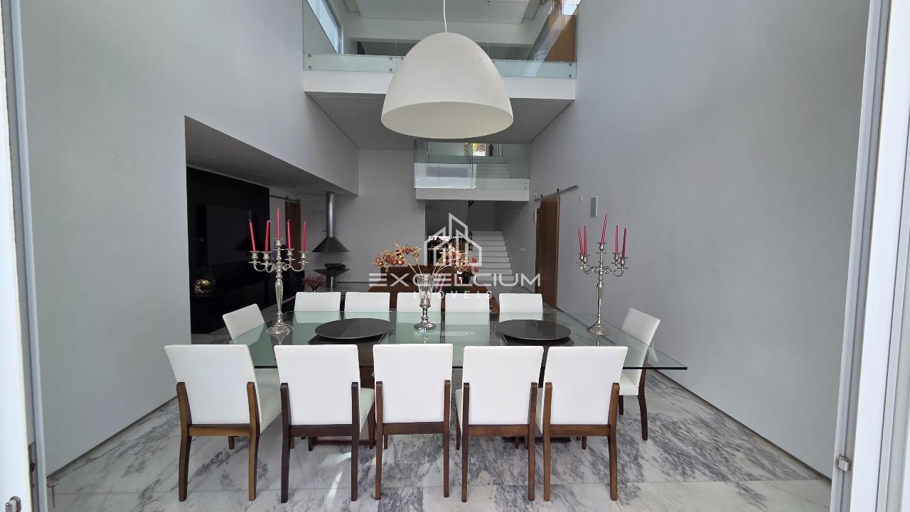 A área de convivência externa mantém o mesmo padrão de acabamento, com espaço gourmet em mármore travertino integrado à piscina e ao spa, criando uma transição fluida entre interior e exterior. A garagem acomoda até oito veículos, com quatro vagas cobertas e quatro descobertas, atributo que reforça a vocação da casa para receber com conforto.