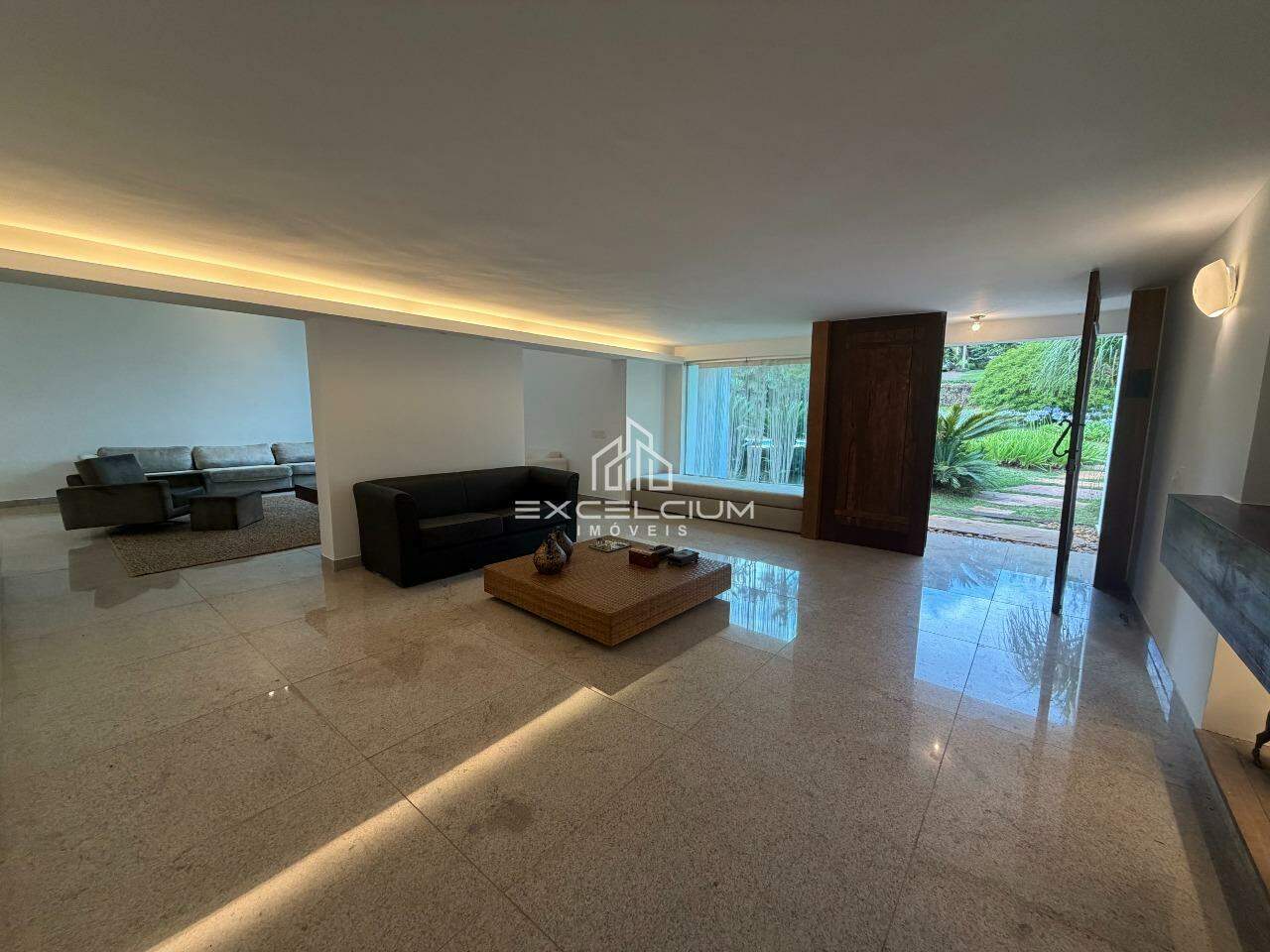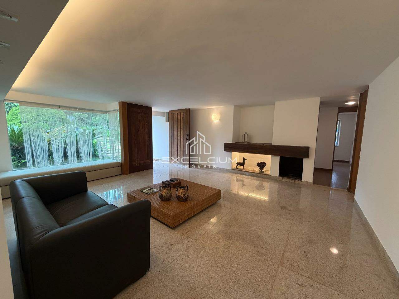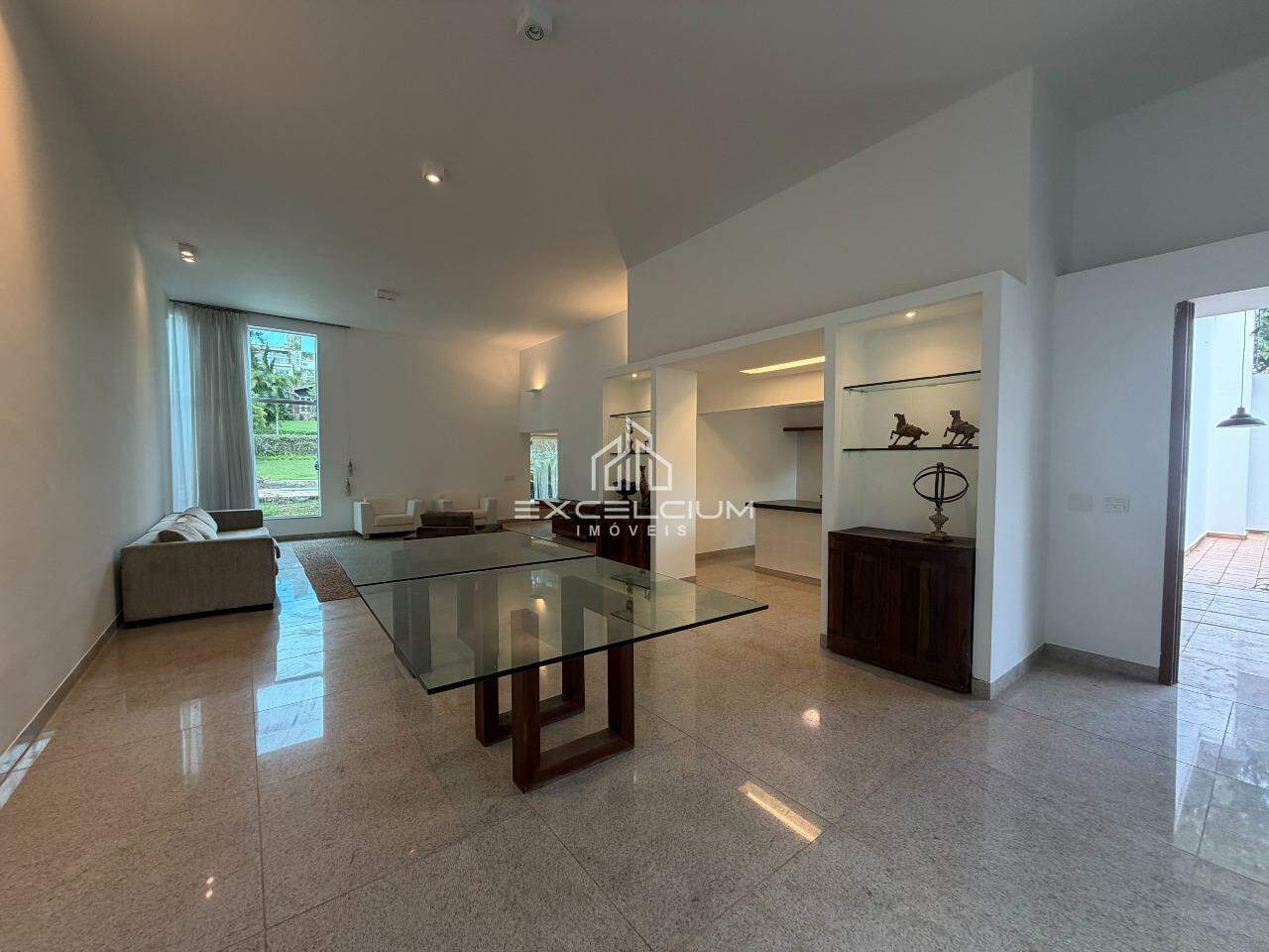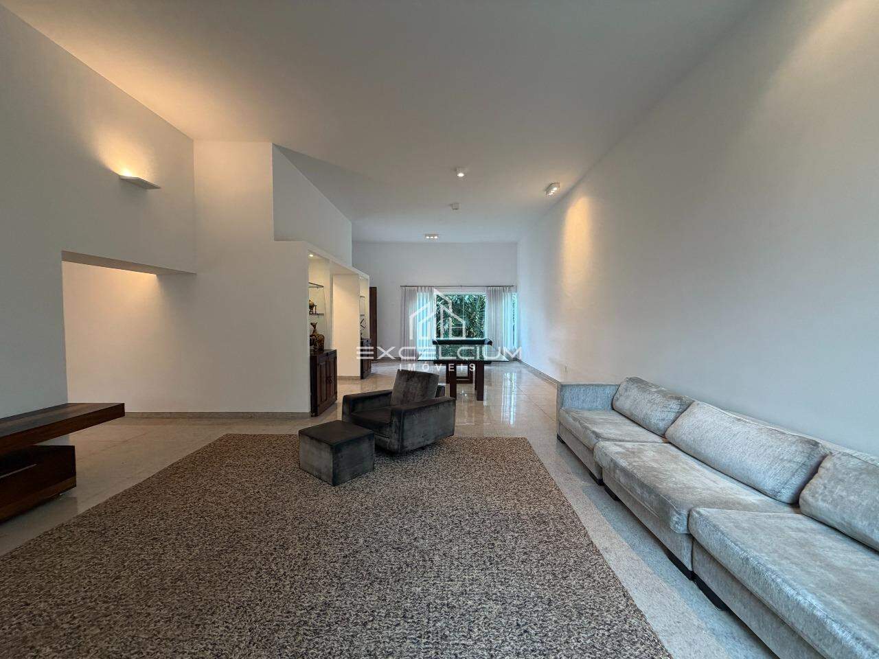 Casa Linear, arquiterura moderna, construída em lote de 2.100m². São 304m² bem distribuidos em 3 salas com piso em granito, sendo a primeira sala com lareira e lavabo, sala de estar e jantar com pédireito alto, 3 quartos, sendo um suíte com closet, 3 banhos, cozinha com ilha, bancadas em granito, fogão e armários.