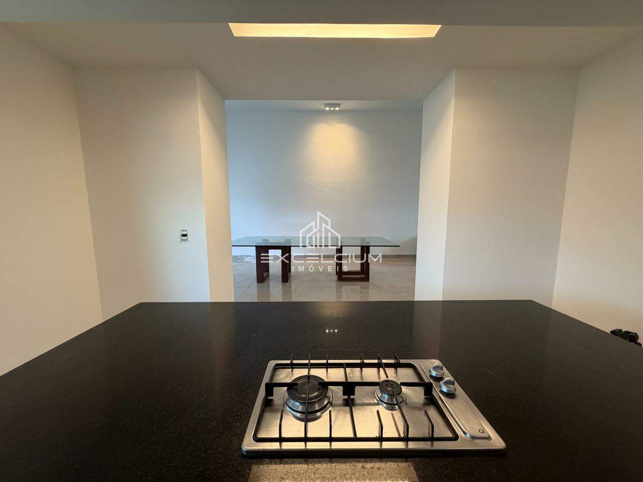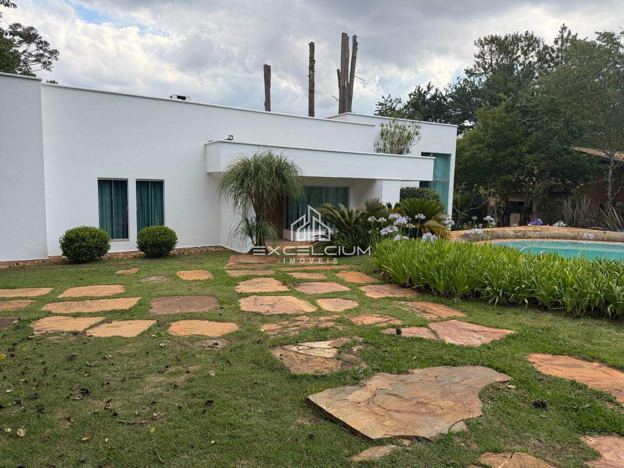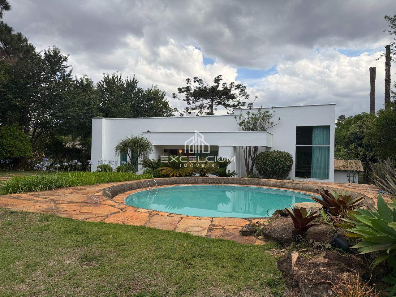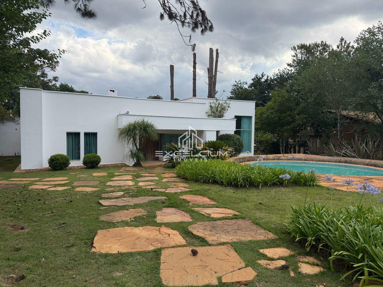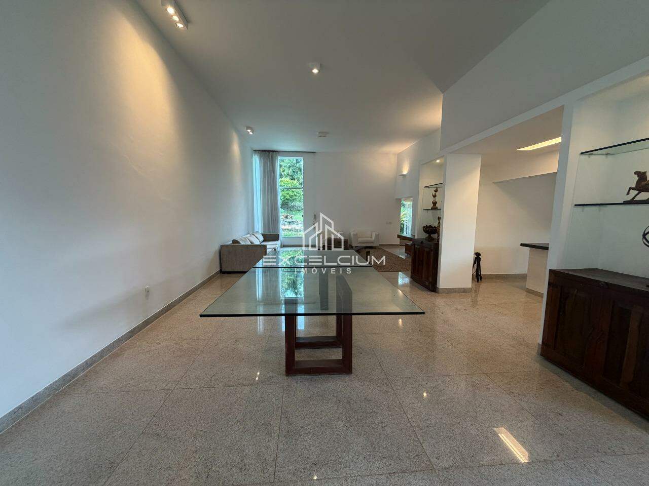 Casa Linear, arquiterura moderna, construída em lote de 2.100m². São 304m² bem distribuidos em 3 salas com piso em granito, sendo a primeira sala com lareira e lavabo, sala de estar e jantar com pédireito alto, 3 quartos, sendo um suíte com closet, 3 banhos, cozinha com ilha, bancadas em granito, fogão e armários.