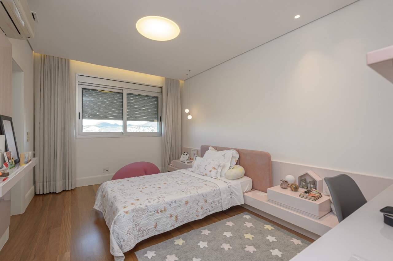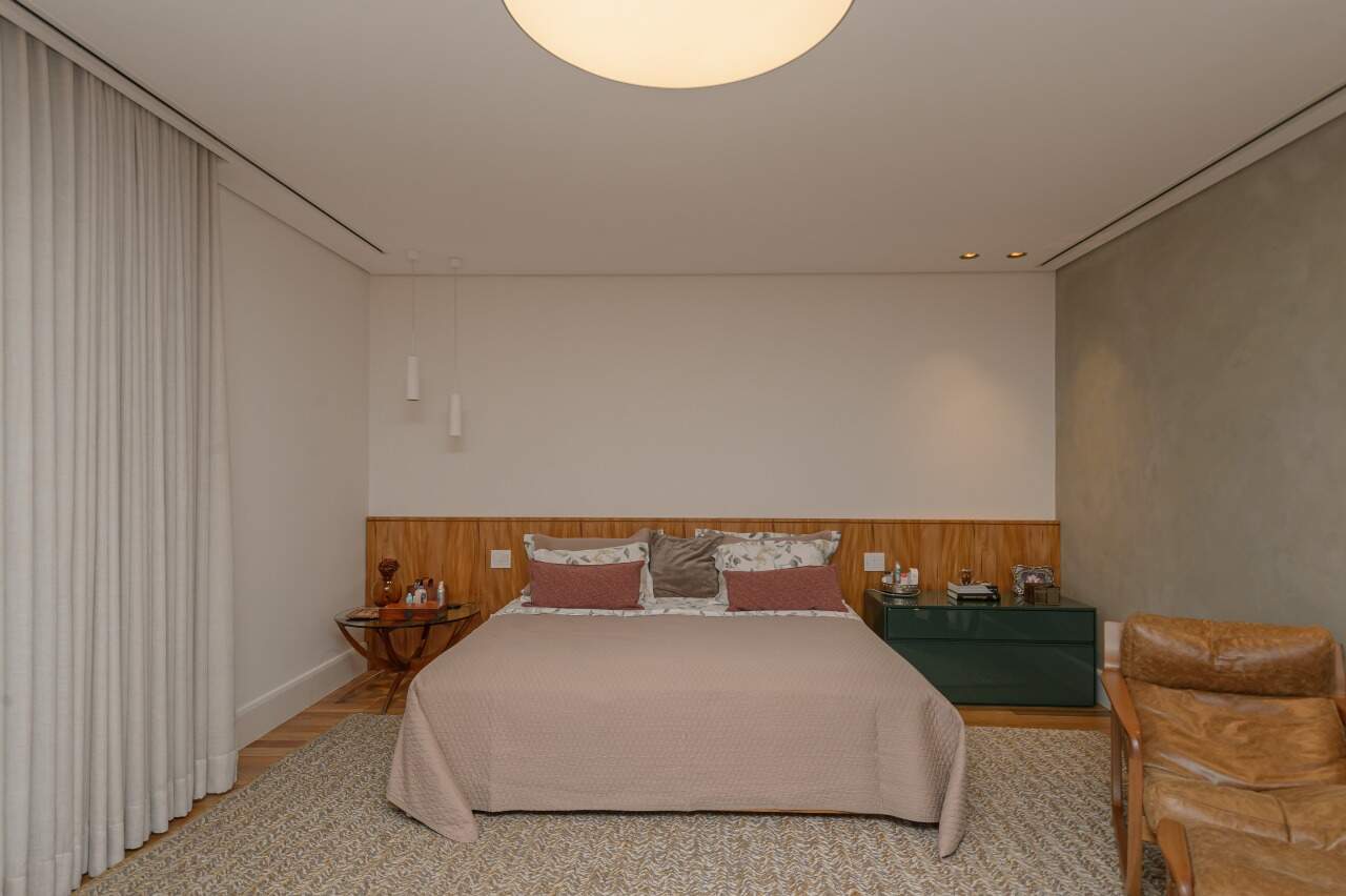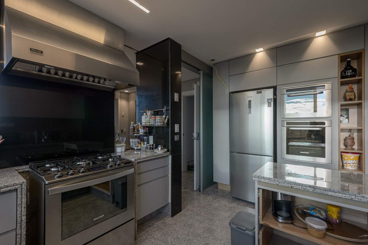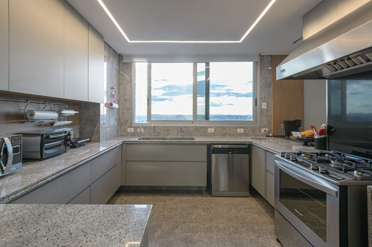 São quatro suítes, projetadas para garantir conforto e privacidade. A suíte máster dispõe de varanda privativa e dois closets, unindo funcionalidade e requinte. A cozinha, ampla e planejada, é acompanhada de despensa, área de serviço, dependência completa e cinco vagas de garagem, além de depósito individual.