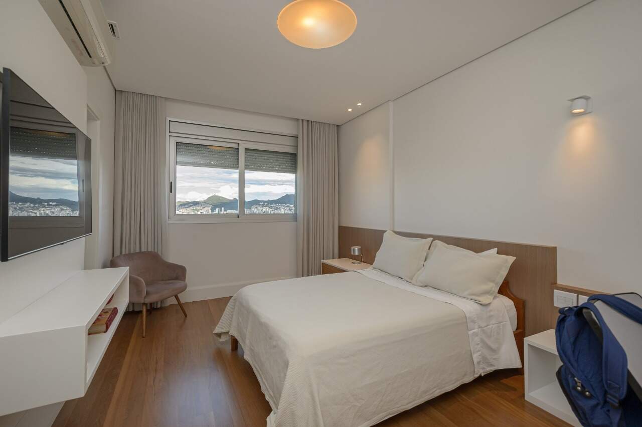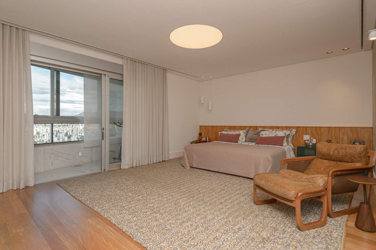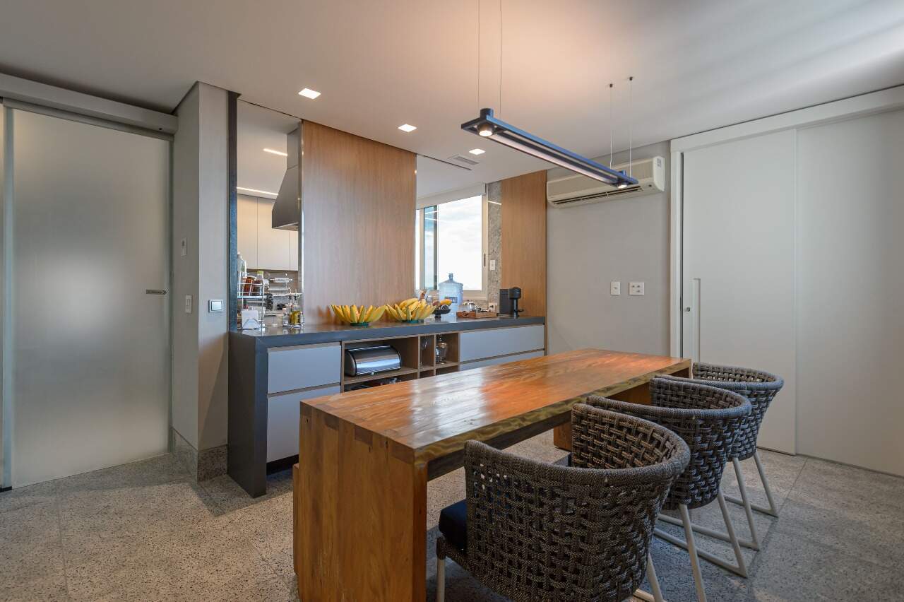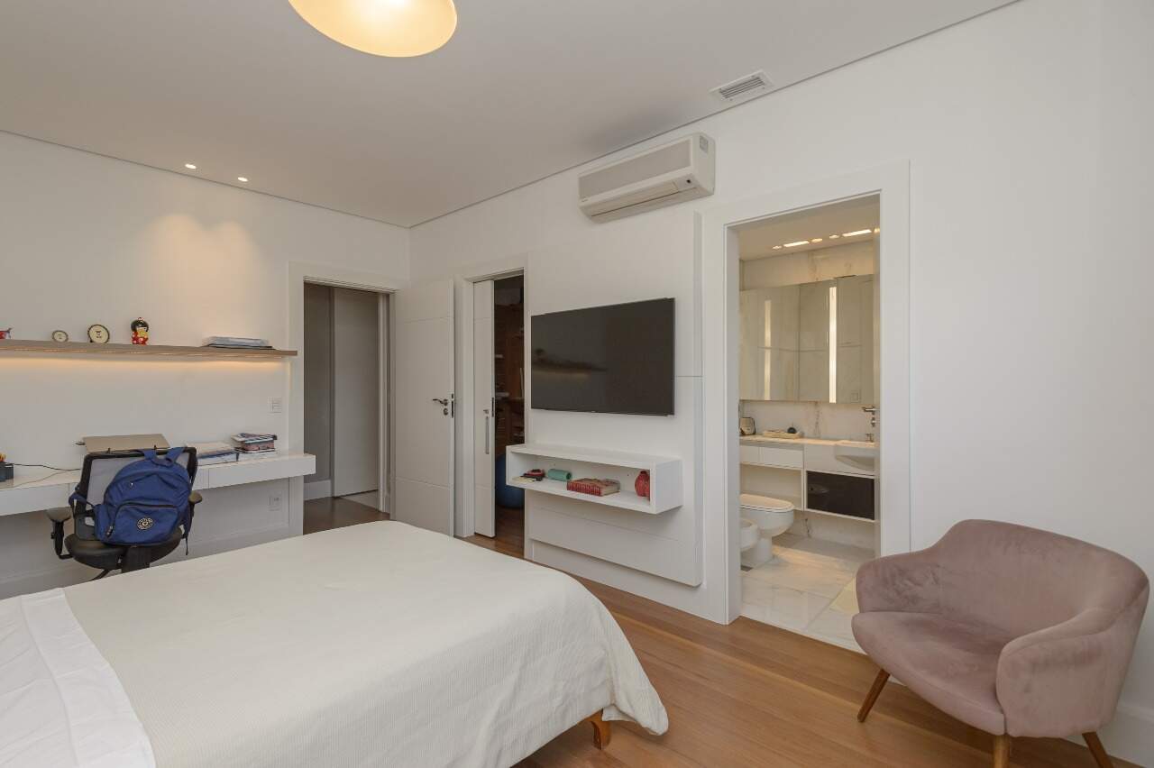 São quatro suítes, projetadas para garantir conforto e privacidade. A suíte máster dispõe de varanda privativa e dois closets, unindo funcionalidade e requinte. A cozinha, ampla e planejada, é acompanhada de despensa, área de serviço, dependência completa e cinco vagas de garagem, além de depósito individual.